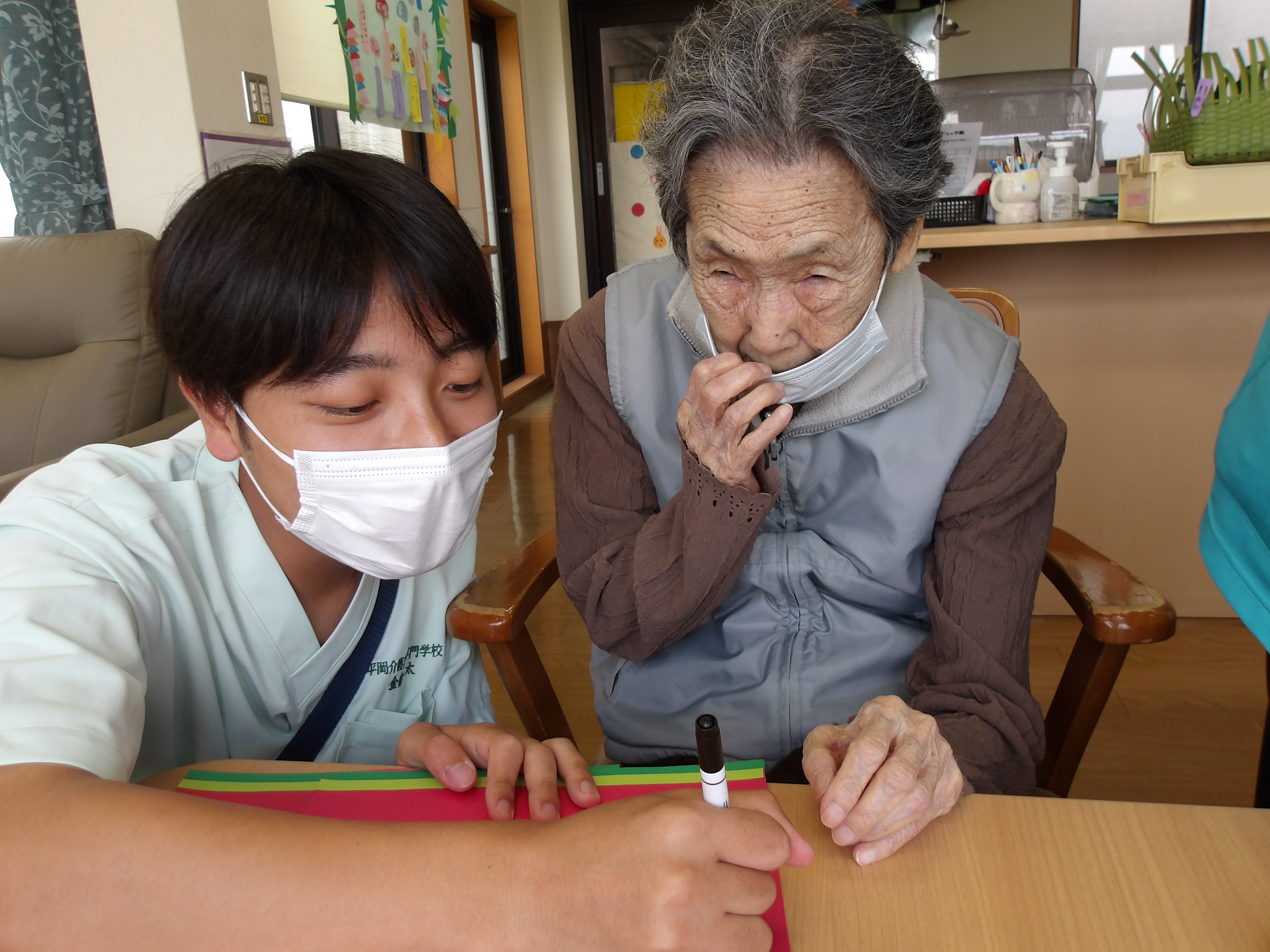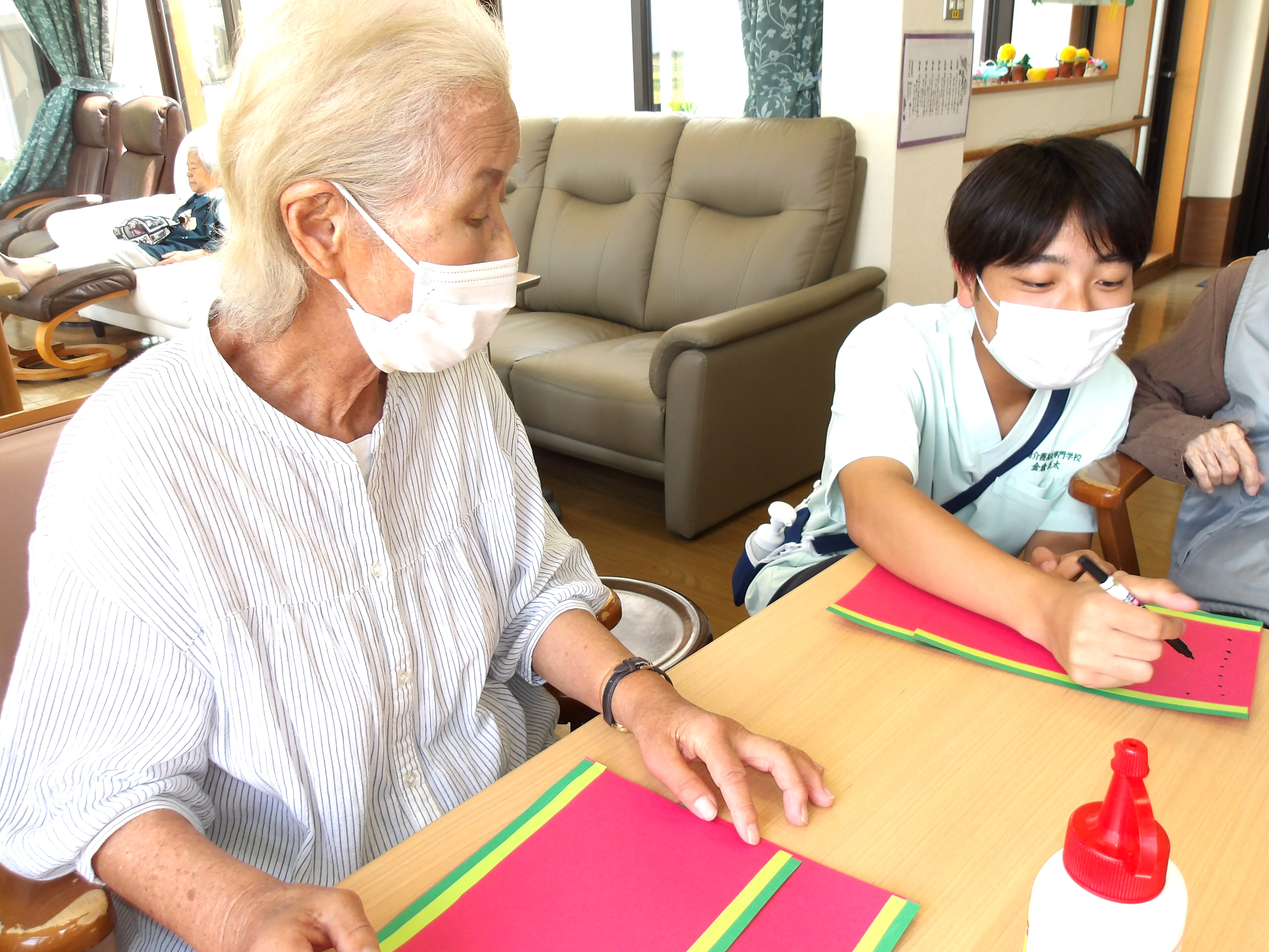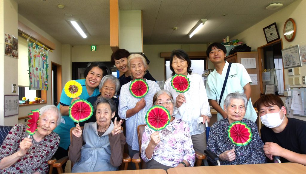 みなさんこんにちは!連日溶けそうなくらい暑い日が続いていますね💦35度に迫る猛暑の中、「暑いね~!」と言いながらも、今日は施設入所者の方をお招きしてみんなでスイカの形のうちわを作りました🍉
