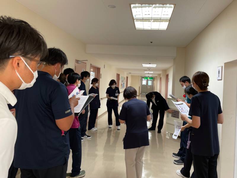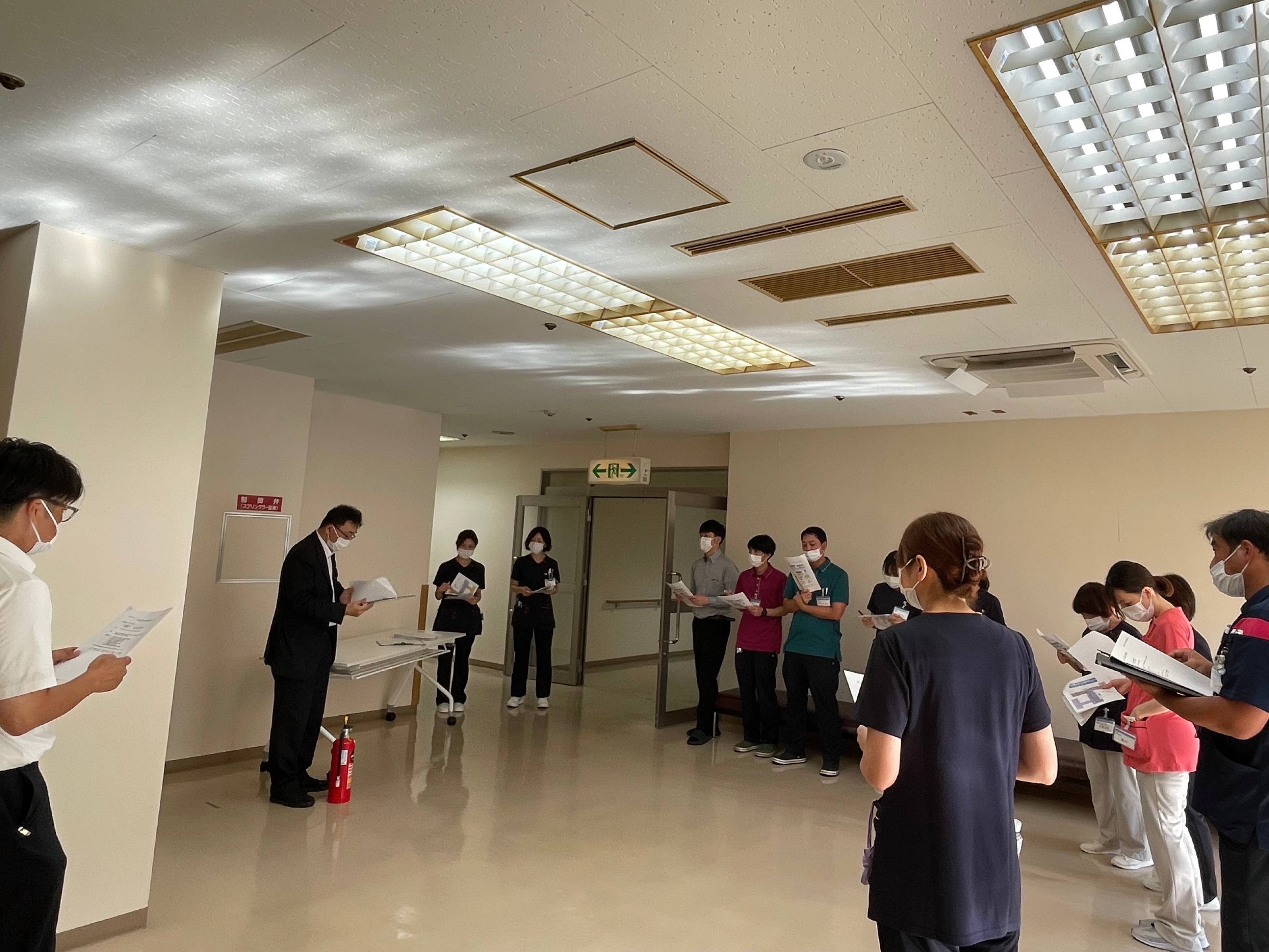 訓練中は、各職員がそれぞれの役割を認識し、対応する事の必要を確認し、特に、患者・入居者の安全な誘導や、要支援者への声かけ・見守りといった行動には、日頃のチーム連携が必要である事を再確認致しました。
