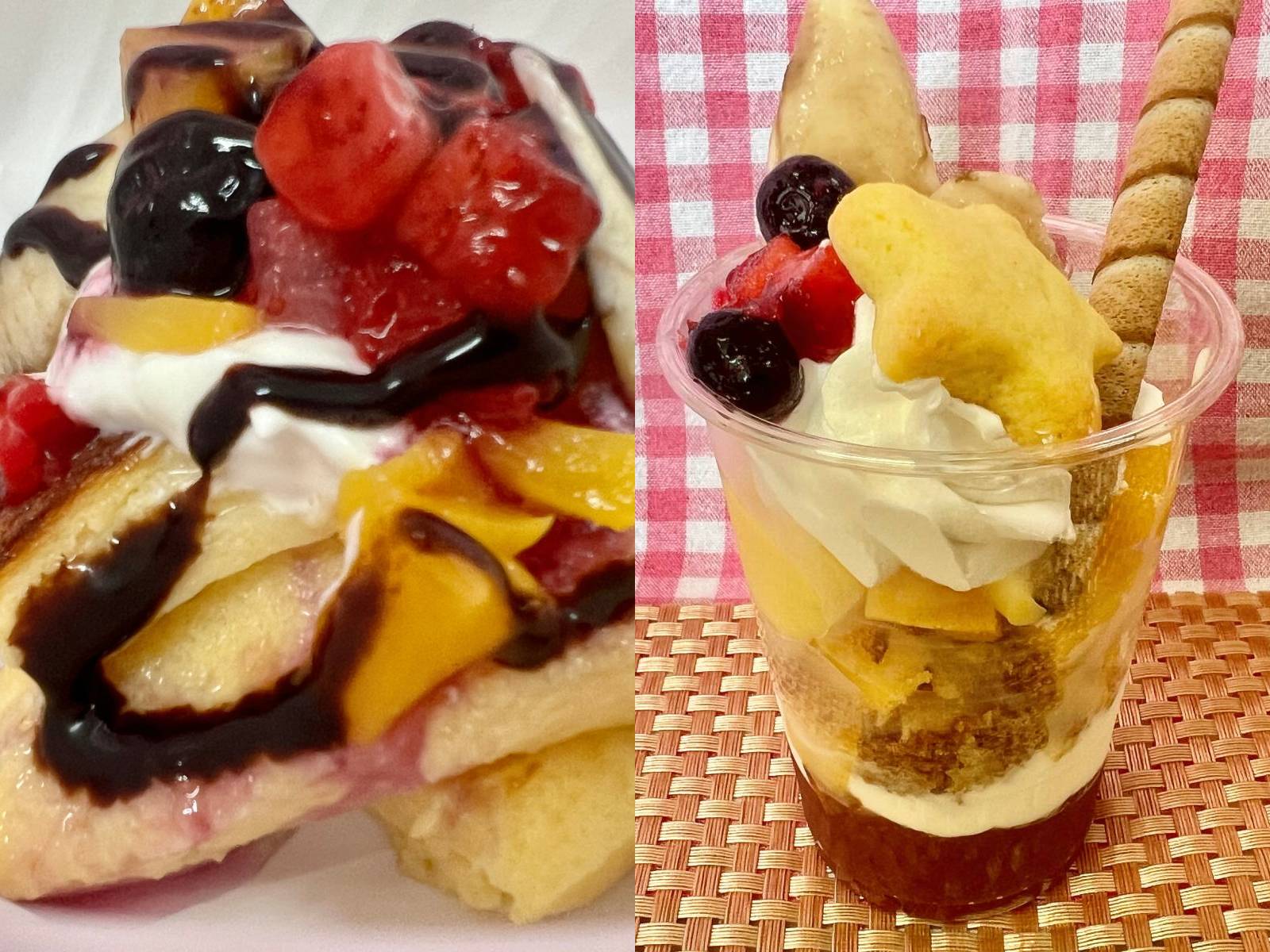 スポンジケーキといちごゼリーをベースに、桃缶、バナナ、いちご、ラズベリー、生クリームを重ねた層仕立てのパフェ。