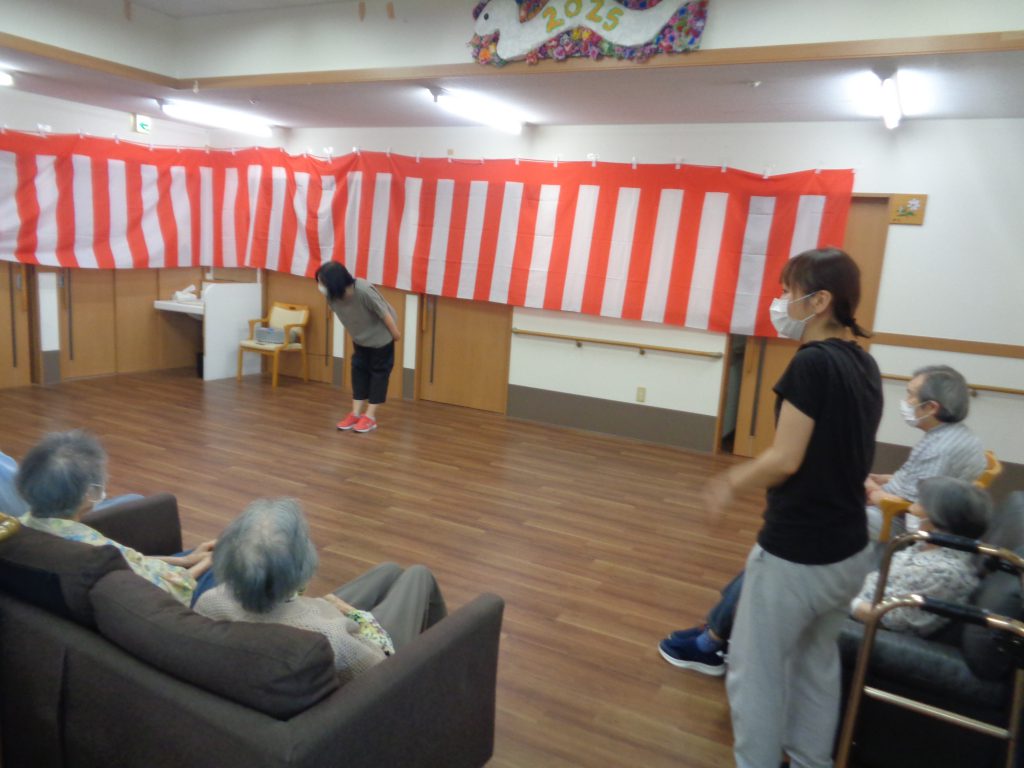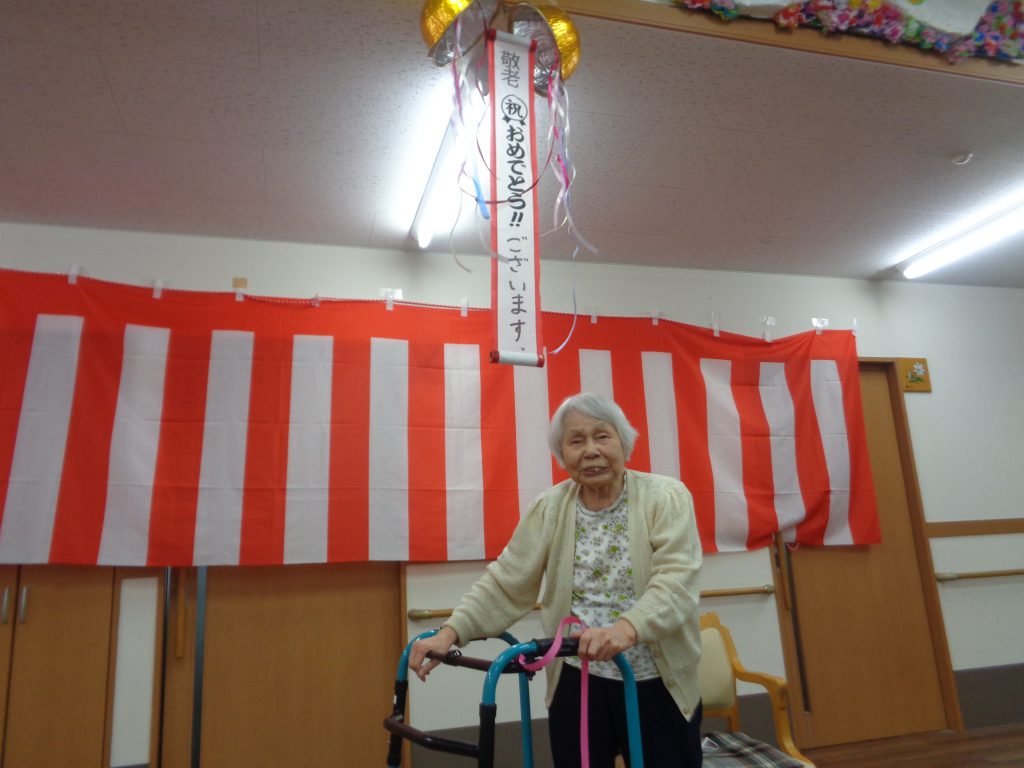 余興も終了したところで、毎年敬老会恒例のくす玉割りです。勝手にくす玉が割れてしまうというハプニングもありましたが、気を取り直して御年101歳・おもやい最高齢のO様に割って頂きました。