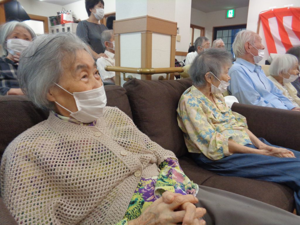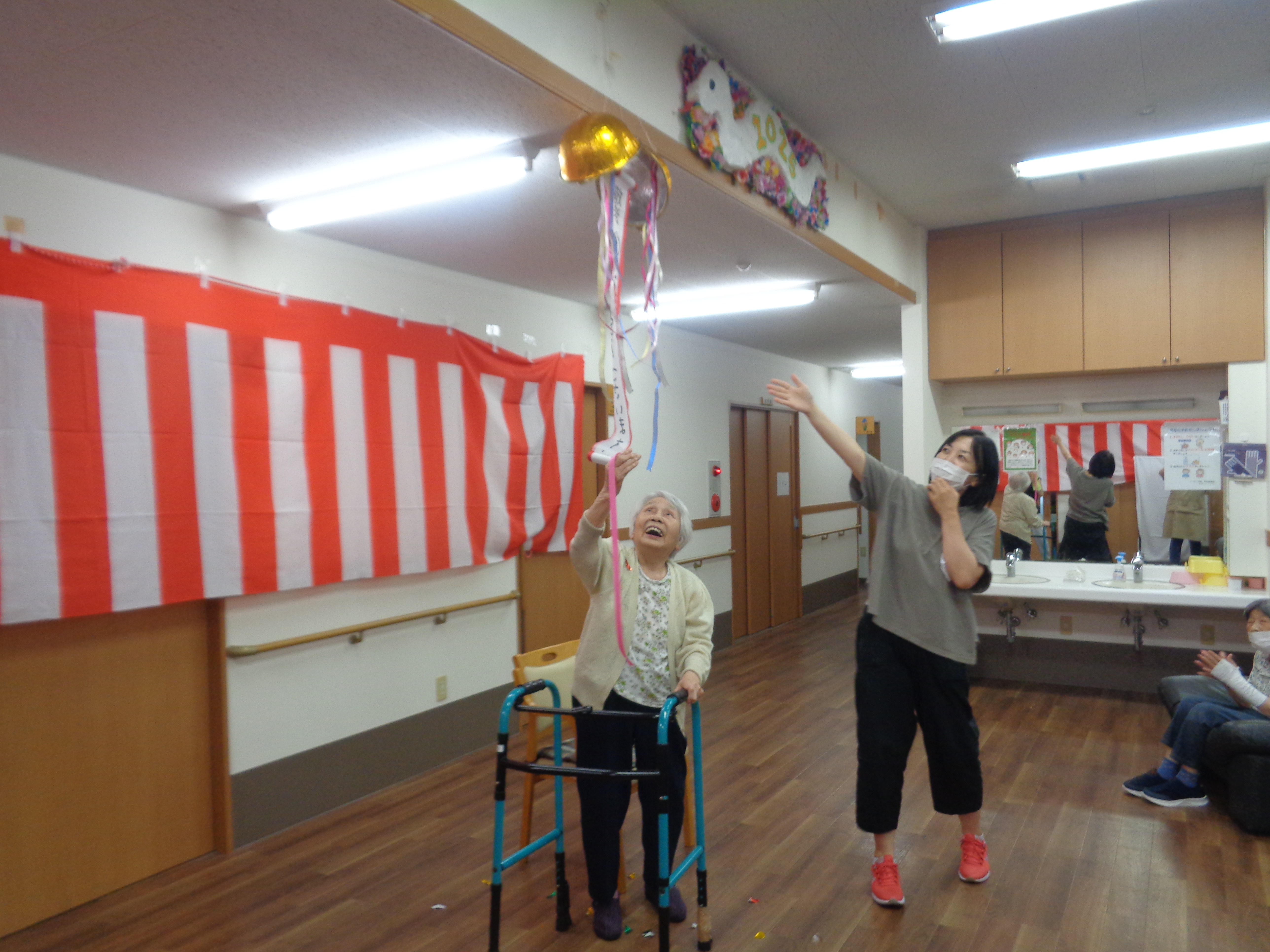 余興も終了したところで、毎年敬老会恒例のくす玉割りです。勝手にくす玉が割れてしまうというハプニングもありましたが、気を取り直して御年101歳・おもやい最高齢のO様に割って頂きました。
