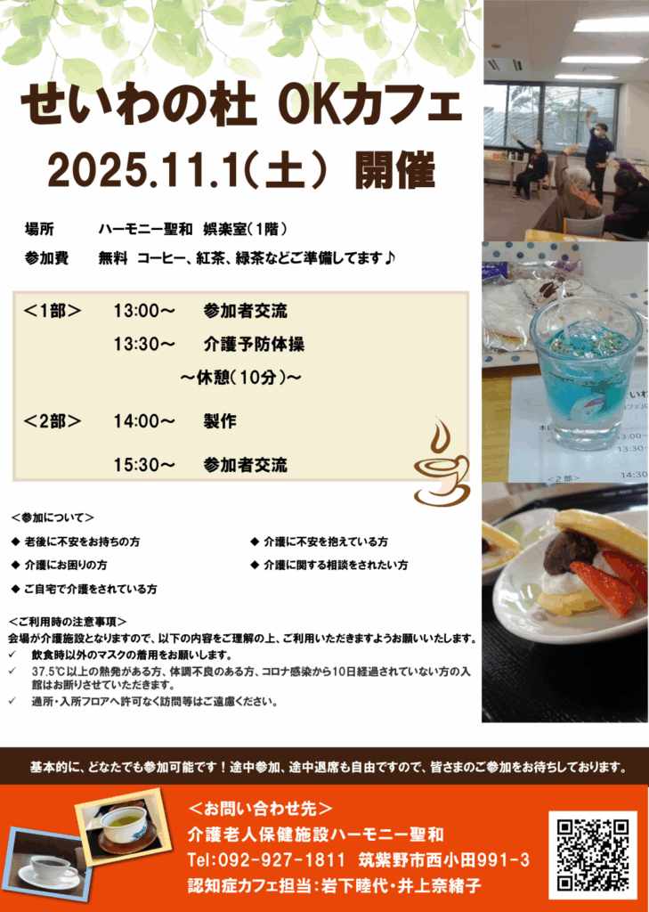 せいわの杜 OKカフェ(認知症カフェ)の取り組み|医療法人せいわ会/介護老人保健施設 ハーモニー聖和 (seiwa-kai.com)次回は11月1日の開催になります。