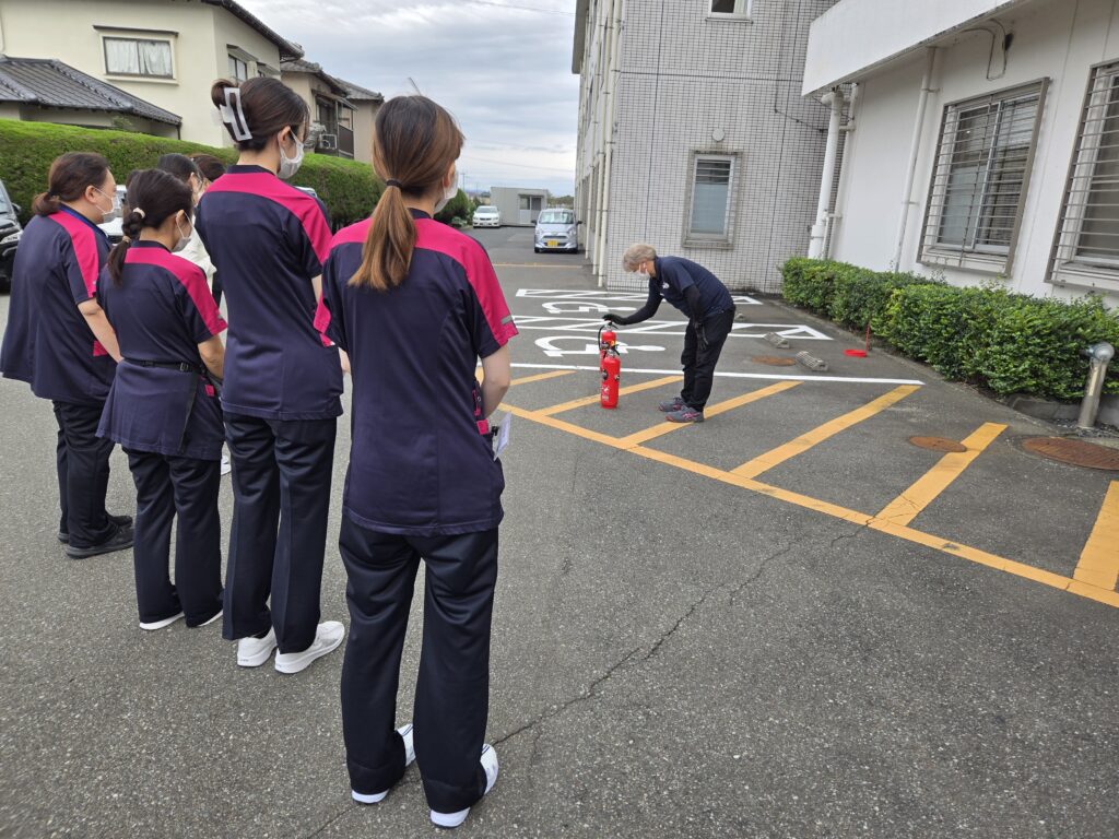 訓練後は、消火器を使った初期消火訓練も行い、職員一人ひとりが火災時の対応手順を実践的に学びました。