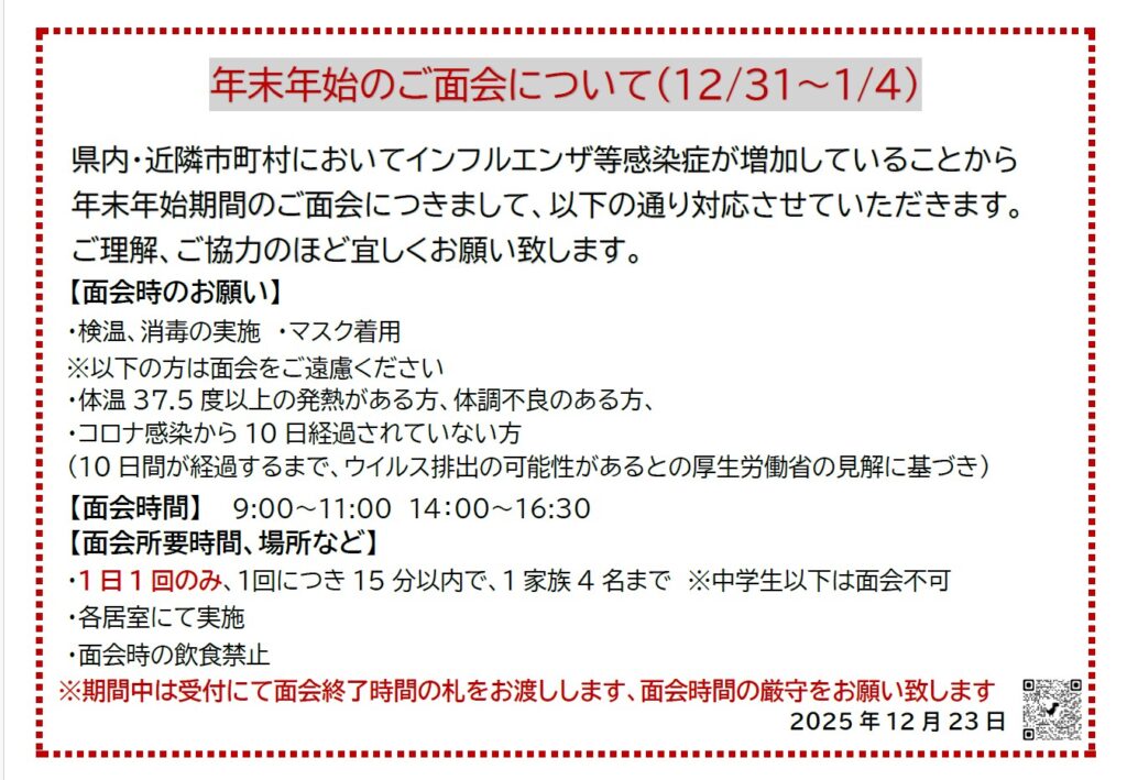 年末年始のご面会について ハーモニー聖和 2025/12/23 17:19 ハーモニー聖和では、県内外の感染症流行を受け年末年始(12/31~1/4)のご面会につきまして、 以下の通りの対応させていただきます。 ご理解とご協力の程、宜しくお願い致します。 【面会時間等変更点】 ・1日1回のみ ・1回につき15分以内 時間厳守とするため受付にて面会終了時間の札をお渡しします ※面会時間や面会人数の変更はありません ご不明な点がありましたら、職員までお問合せください ハーモニー聖和 次の記事へ 一覧に戻る 前の記事へ