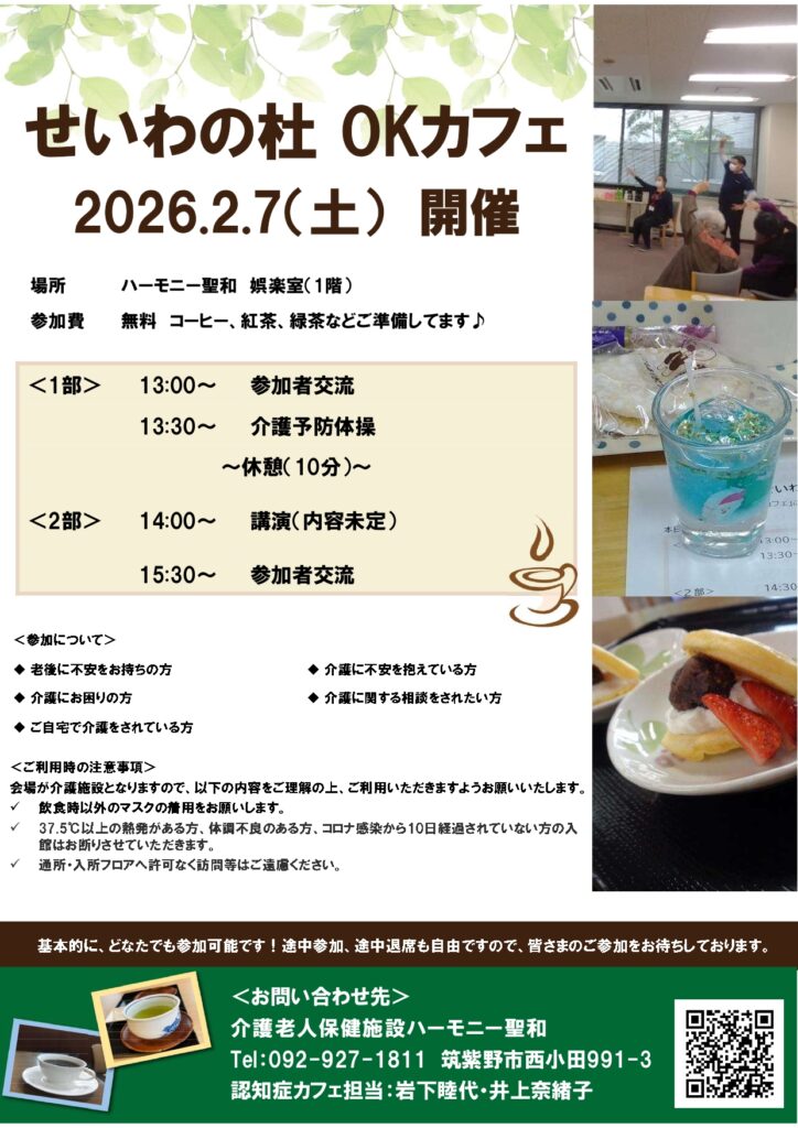 せいわの杜 OKカフェ(認知症カフェ)の取り組み|医療法人せいわ会/介護老人保健施設 ハーモニー聖和 (seiwa-kai.com)