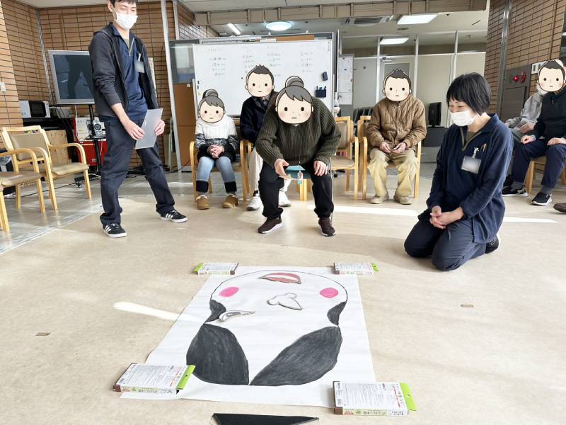 参加者の皆さんは椅子に座ったまま、床に置かれた大きな顔の台紙に向かって、目・鼻・口などのパーツを“投げて”配置します。目隠しはせず、狙いを定めて「えいっ!」と軽く投げるスタイルです。