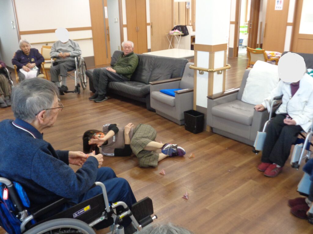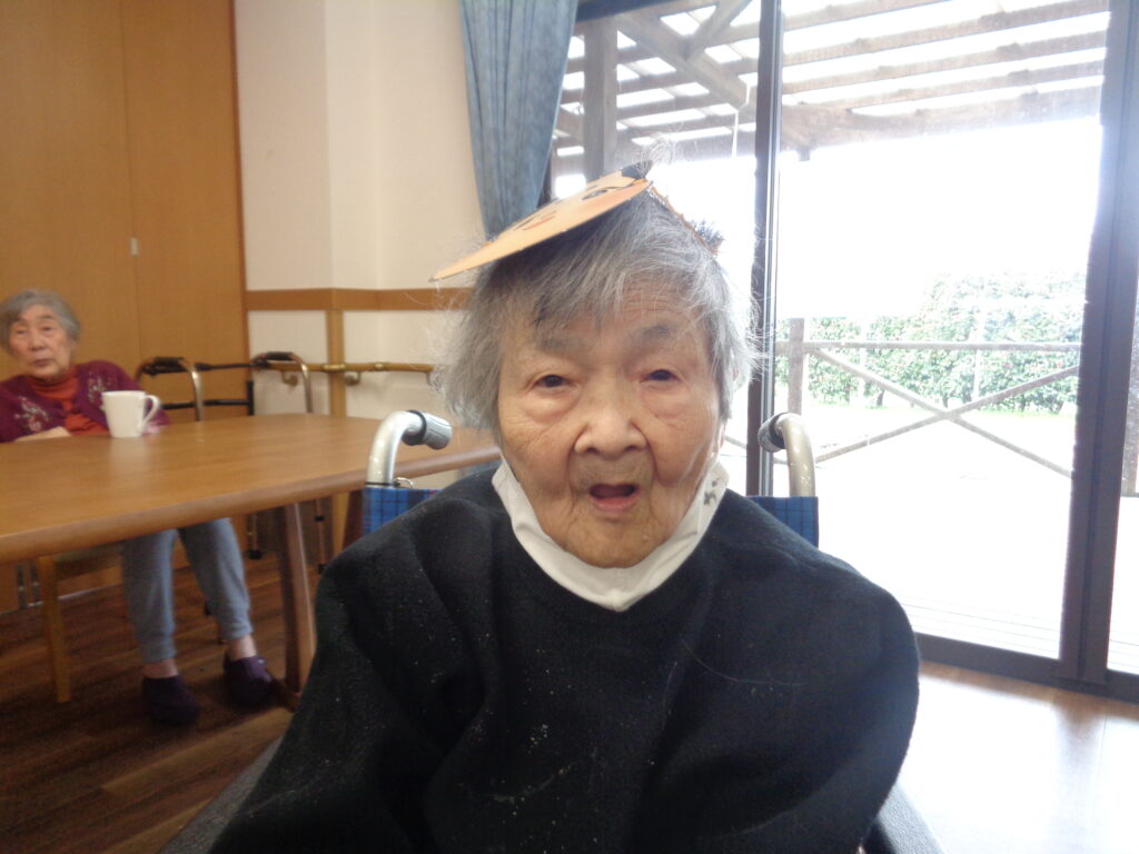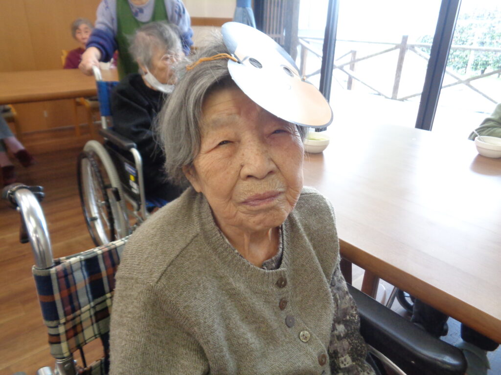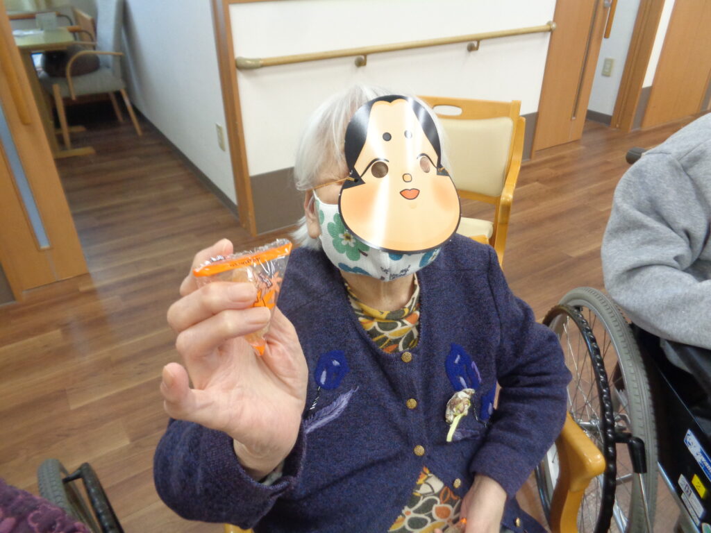 グループホームおもやいでも毎年節分行事を開催しており、今年は11日に開催。皆様に個包装の甘納豆をお渡しすると、豆まく前に開封され召し上がろうとされる方が数名いらっしゃいましたが、無事に鬼を退治することができました。