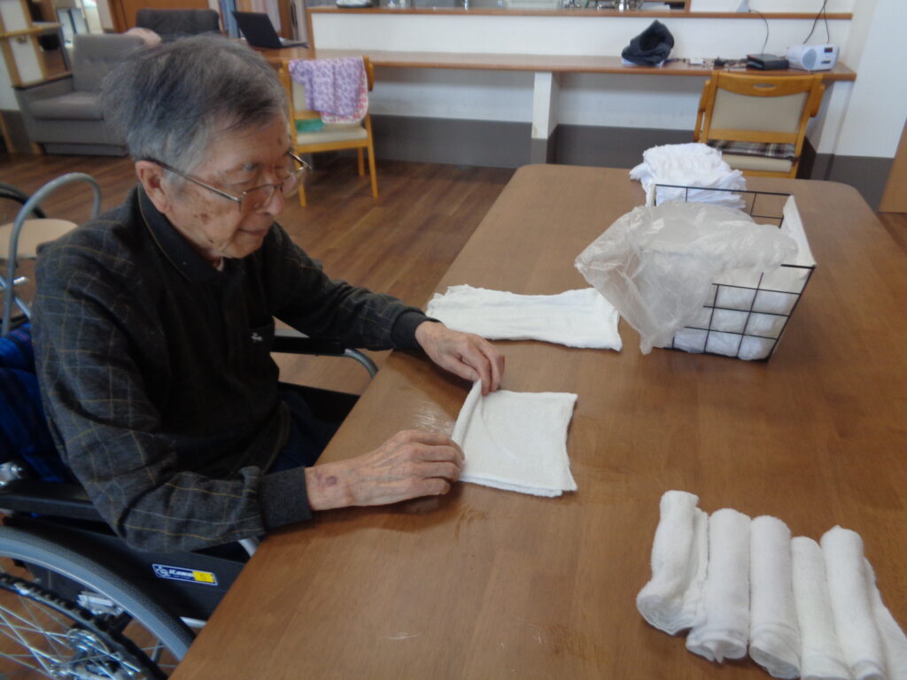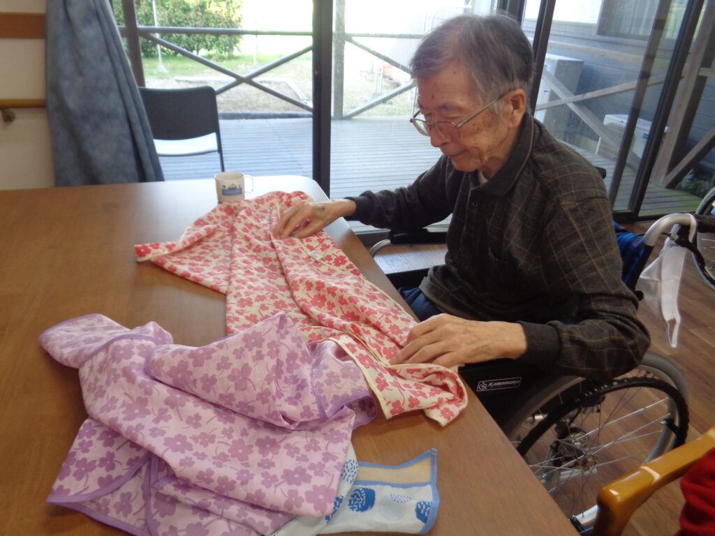 時には洗い物や、毎日使用する清拭布たたみやエプロンまで。皆様丁寧に手慣れています。時代は代わりました。おもやいの男性陣は働き者です!もちろん女性陣も。依頼しなくても、「手伝おうか?」とすすんで手伝ってくれる方もいらっしゃいます。皆様のお力添えのお陰でおもやいの生活は成りたっております。いつもありがとうございます。